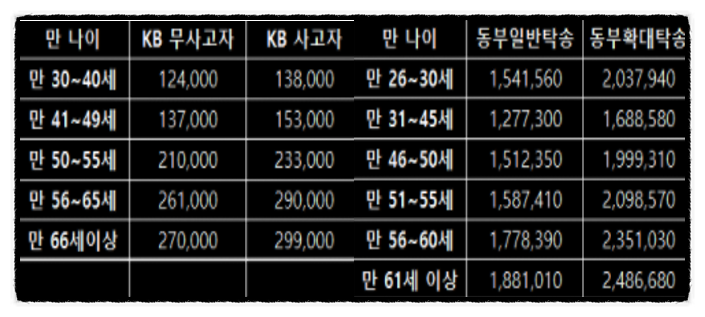 61세 이상 150,000에서 280,000 까지 입니다. 단 동부보험은 절대적인 수치는 아닙니다. 유사치 이고 실제적으로 견적을 받아 봐야 알수 있습니다.